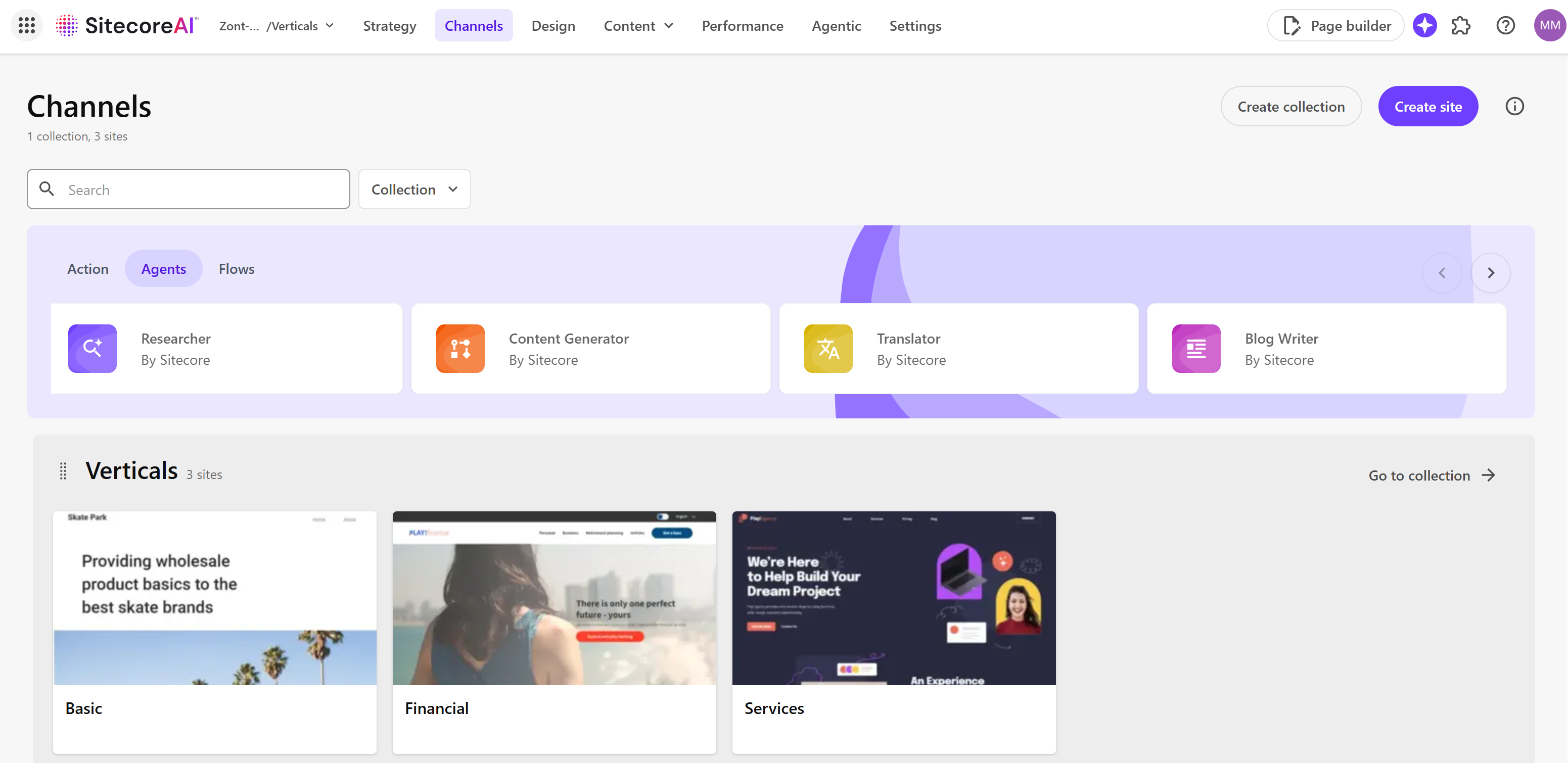 In SitecoreAI, Channels is the primary workspace for building and managing digital experiences, it centralizes everything needed to create and organize sites and site collections. You open it from the navigation menu by selecting Channels. Within Channels, teams can create and manage sites from templates or copies, adjust site settings, and open sites in Page Builder for content updates. They can also create and manage site collections to group related sites for shared resources and organized projects, build web pages in Page Builder to design, edit, and personalize with components and content, and personalize and test experiences by creating page variants and running A/B/n tests on components.