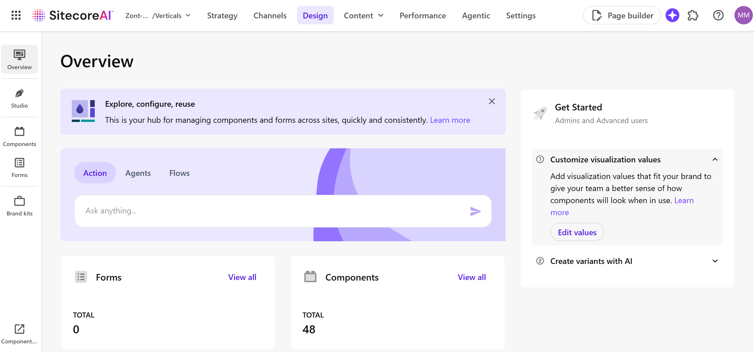 SitecoreAI Design is a unified workspace that brings together the Design studio, components, forms, and brand kits so teams can create, configure, and publish reusable building blocks for Page builder. From the Design sidebar, users can see totals for draft and live items, open full lists, adjust visualization values, generate variants with AI, and access the Agentic studio widget. To use agentic features, Stream must be enabled in the Sitecore Cloud Portal. Forms can be built or templated and activated in Page builder, and brand kits align AI generated content to brand guidelines through uploaded source documents and access controls.