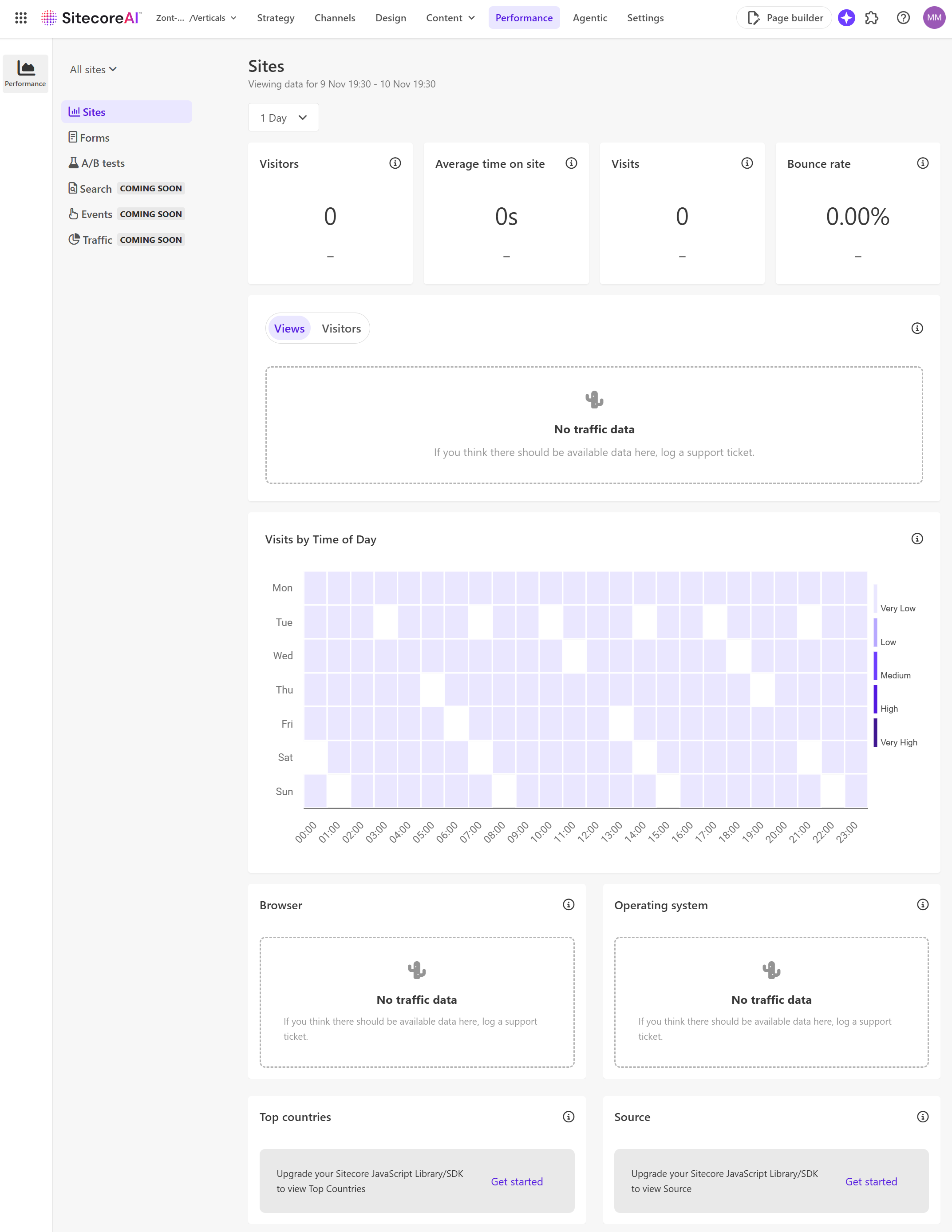 SitecoreAI Performance gives one place to monitor how experiences perform across sites, forms, and experiments, and to measure the impact of changes. You must first create an analytics identifier and assign it to your site, you can use the same identifier across multiple sites to consolidate data. The Performance entry point summarizes activity and links to the Sites, Forms, and A/B/n tests dashboards, with Search, Events, and Traffic marked as coming soon. You can also turn on a Demo switch to view mock data. Additional views include Page insights in Analyze for page level analytics and a customizable Sites dashboard per site.