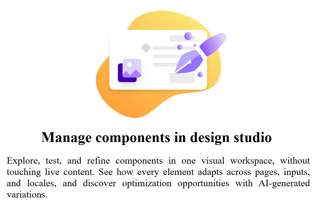 Key benefits include AI powered generation of component variants to accelerate prototyping, reduce repetitive setup, and explore alternative styling and structure while encouraging accessibility and consistency. The studio improves discovery and coherence by letting teams browse components across sites, search with filtering, compare variants, and see how components render per site. It also provides a safe space for real time testing of field values, layout, styling, and responsiveness across devices, plus the option to access component code to explore AI assisted improvements, with insights feeding into final Page builder setups.